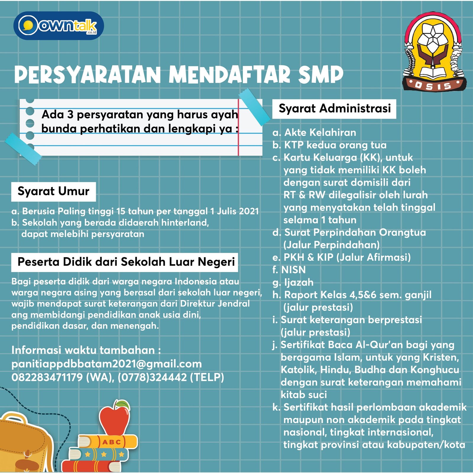 Sementara itu, Untuk calon siswa Sekolah Menengah Pertama (SMP), Owntalk telah merinci persyaratan yang harus disiapkan, yakni :