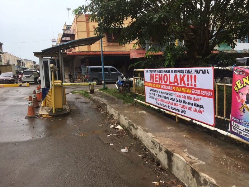 ” Kami atas nama warga komplek pertokoan Aviari Pratama, Menolak parkir khusus (gate parkir) yang dilakukan PT Aviari Pratama secara sepihak. Jika sampai 14 November 2021 ” tidak ada niat baik” dari pihak PT Aviari Pratama untuk duduk bersama warga, Kami (Warga) “akan melakukan aksi turun ke jalan pada hari Senin 15 November 2021” tulis spanduk seperti yang dilihat kantor Berita Owntalk, Senin, (15/11).