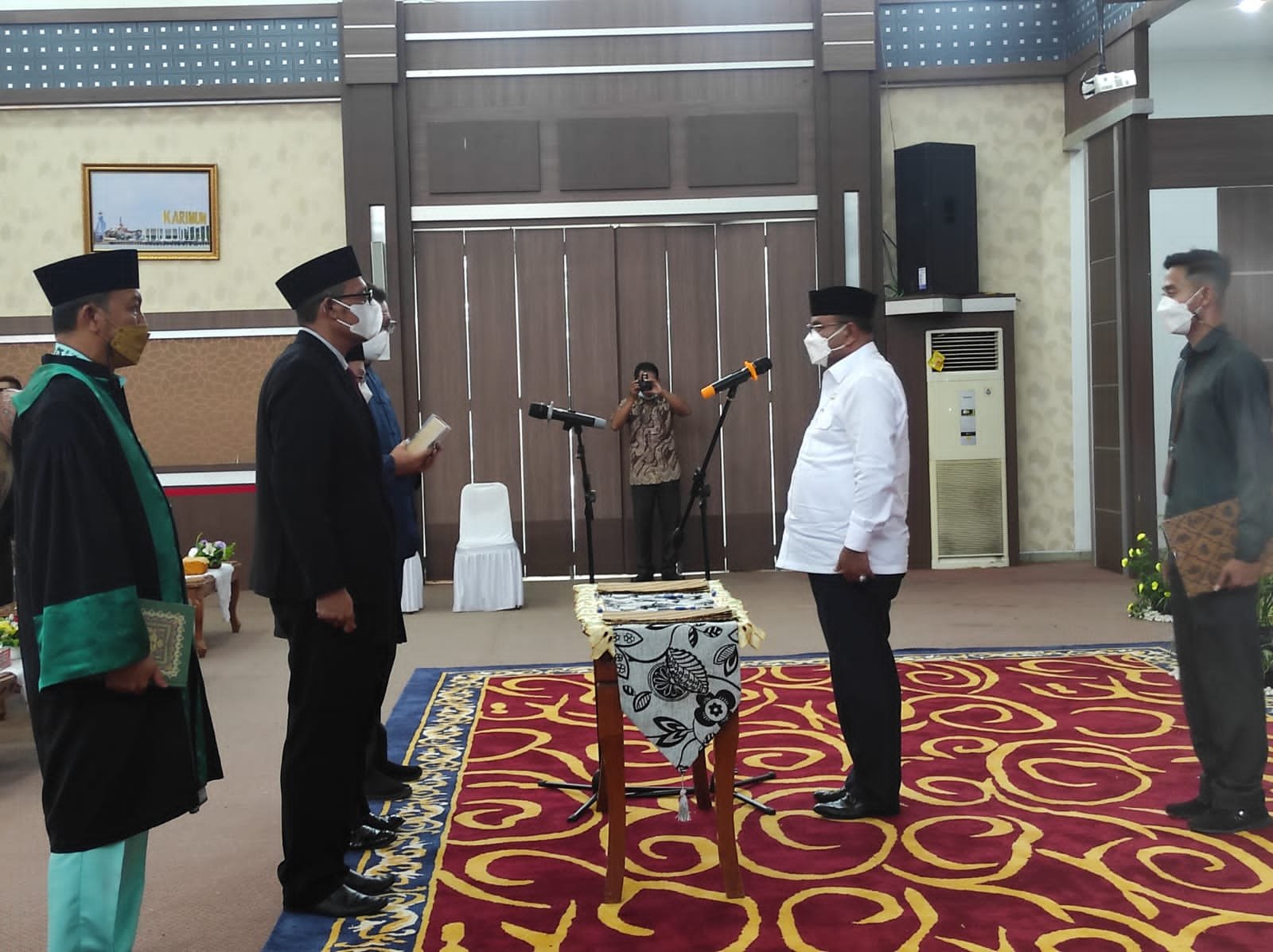 Karimun, Owntalk.co.id – Bupati Karimun Aunur Rafiq melantik dan mengambil sumpah jabatan Direktur Utama dan Direktur Kepatuhan perusahan daerah Bank Perkreditan Rakyat Karimun yang di gelar di Gedung Nilam Sari, Jumat (17/12/2021).