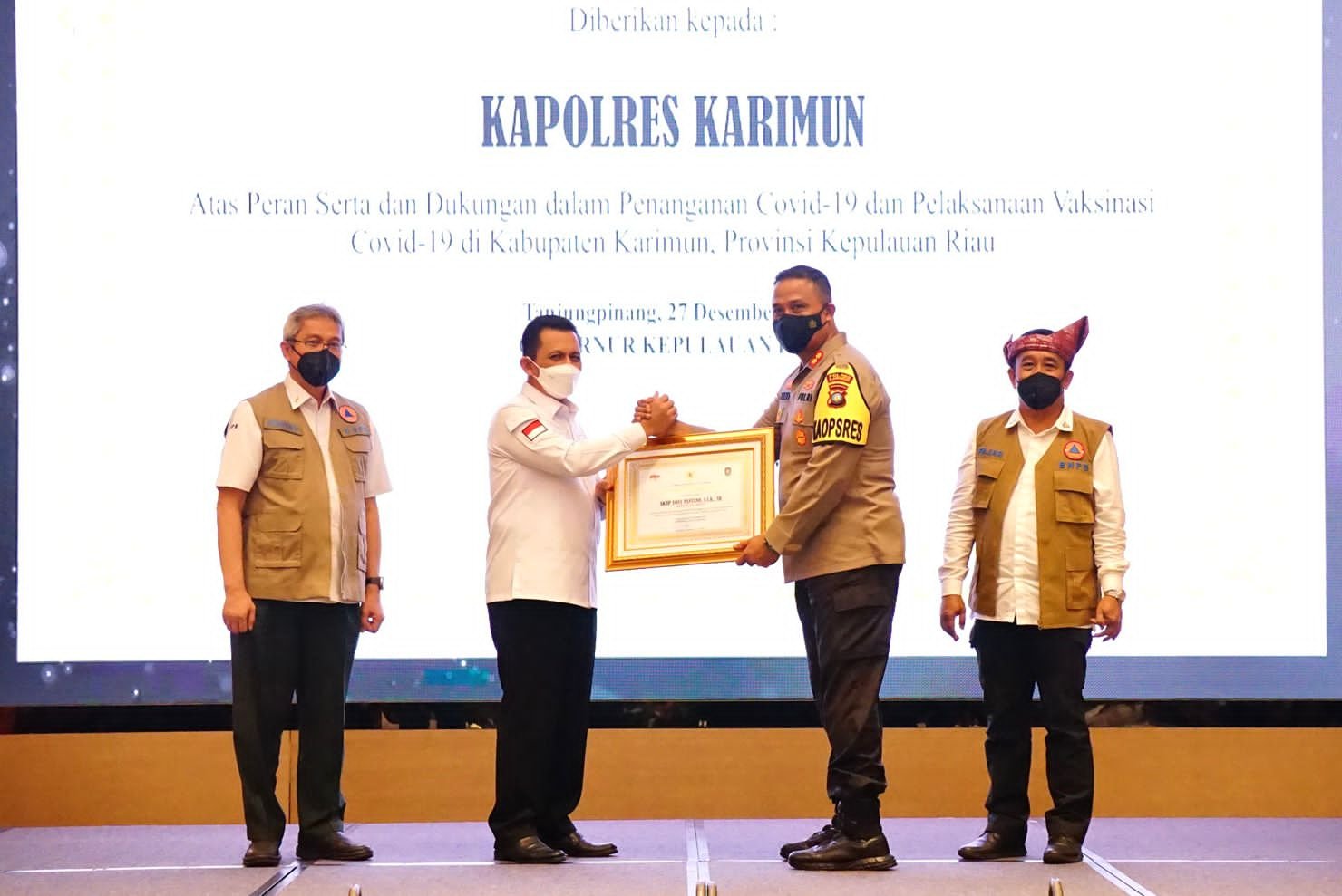 Karimun, Owntalk.co.id -Kapolres Karimun AKBP Tony Pantano, SIK, SH menerima penghargaan dari Gubernur Kepri. Penghargaan diberikan atas peran serta dan dukungan dalam penanganan covid-19 dan pelaksanaan Vaksinasi covid-19 di Kabupaten Karimun, Provinsi Kepulauan Riau. Kamis (30/12/2021).