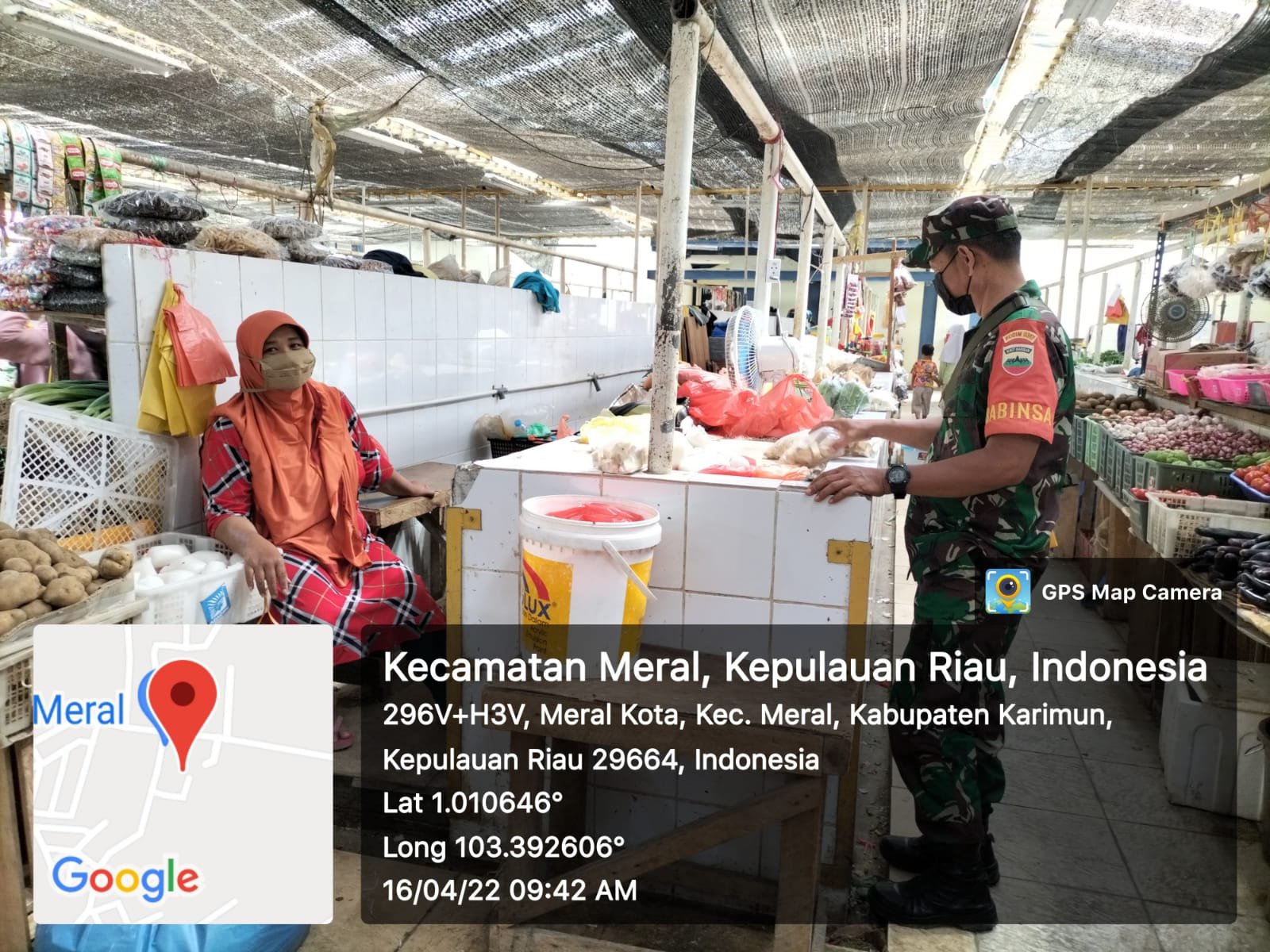 Karimun, Owntalk. co. Id – Babinsa Meral Koramil 01/Balai Sertu Sutaswan melaksanakan kegiatan Komsos dengan pedagang di Pasar Bukit Tembak Kel. Sungai Raya Kec. Meral, 16/04/2022.