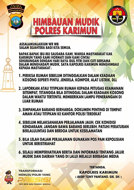 Sehubungan dengan hari raya idul fitri dan cuti bersama dalam menghadapi mudik, saya kapolres karimun menghimbau kepada masyarakat Kabupaten Karimun