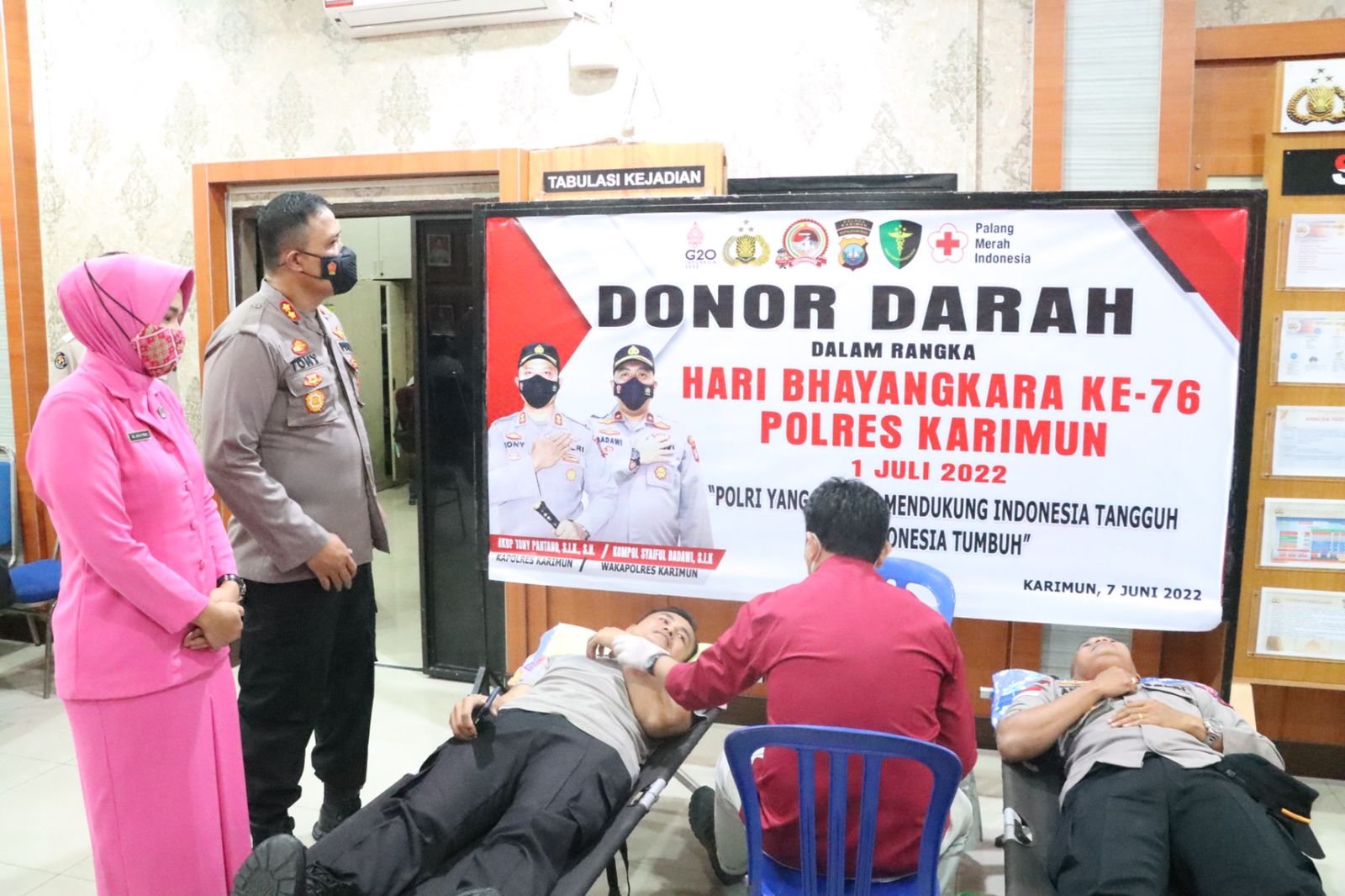 Rangkaian kegiatan menyambut Hari Bhayangkara Ke-76 Polres Karimun melaksanakan beberapa kegiatan diantaranya donor darah. Bertempat diruang rapat utama (rupatama) Polres Karimun, kegiatan donor darah ini juga bertujuan agar dapat menambah stok darah untuk PMI yang diperuntukkan bagi masyarakat yang membutuhkan.