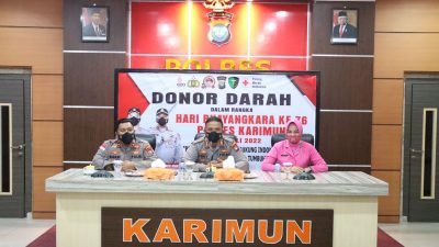 Rangkaian kegiatan menyambut Hari Bhayangkara Ke-76 Polres Karimun melaksanakan beberapa kegiatan diantaranya donor darah. Bertempat diruang rapat utama (rupatama) Polres Karimun, kegiatan donor darah ini juga bertujuan agar dapat menambah stok darah untuk PMI yang diperuntukkan bagi masyarakat yang membutuhkan.