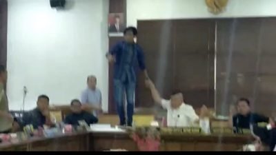 hasil Tangkapan terlihat anggota Dprd Kota Batam Safari Ramadhan manjat Meja saat RDP