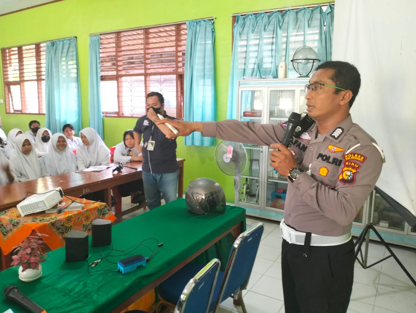 Giat sosialisasi dan safety riding yang berlangsung di SMP Negeri 3 Selatpanjang tersebut dilakukan personel Satlantas antara lain, Bripka Ilfansyah, Briptu Boby Lesmana, Briptu Jery IR, dan tim RSDC Polda Riau.