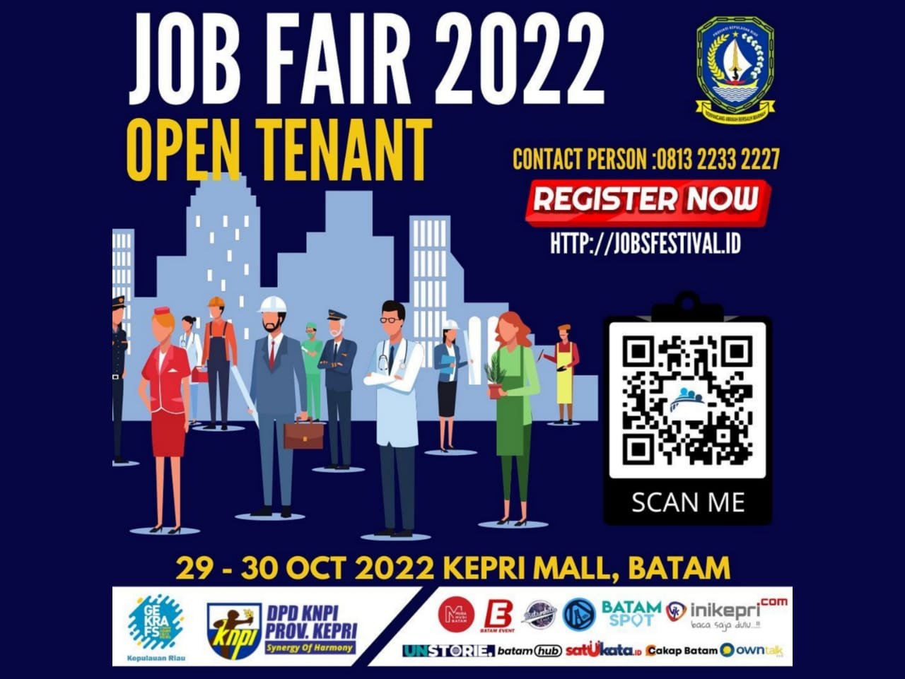 Batam, Owntalk.co.id – DPD KNPI Provinsi Kepulauan Riau (Kepri) dan DPW Gerakan Ekonomi Kreatif Nasional (Gekrafs) Kepri mengundang perusahan yang ada di Kota Batam untuk mengikuti kegiatan pameran lowongan pekerjaan (job fair) yang digelar di Kepri Mall, Kota Batam, pada 29-30 Oktober 2022 mendatang.