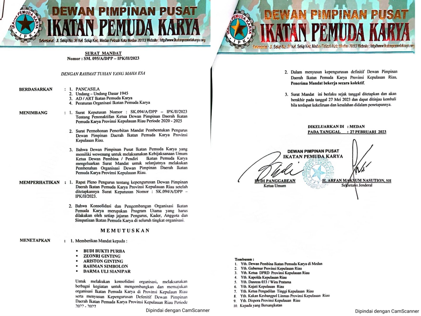 Surat mandat tersebut bernomor : SM.095/A/DPP-IPK/II/2023 yang ditandatangani langsung oleh Ketua Umum Ikatan Pemuda Karya (IPK) Budi Panggabean dan Sekretaris Jenderal H. Arfan Maksum Nasution, SH.