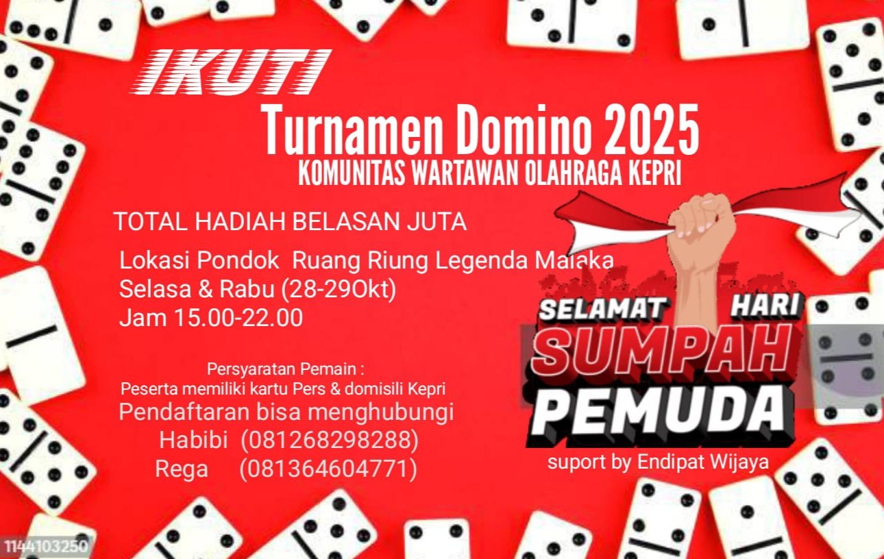 Batam, Owntalk.co.id – Dalam rangka memeriahkan Hari Sumpah Pemuda dan mempererat solidaritas insan pers, Komunitas Wartawan Olahraga Kepri (K-Work) akan menggelar Turnamen Domino 2025 dengan hadiah total mencapai Rp10.750.000.