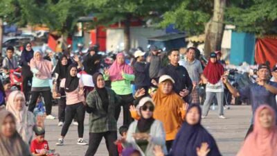 Ratusan warga tampak antusias mengikuti kegiatan Senam Sehat yang digelar DPD KNPI Kepulauan Riau di Lapangan SP Plaza Sagulung, Minggu (2/11/2025).