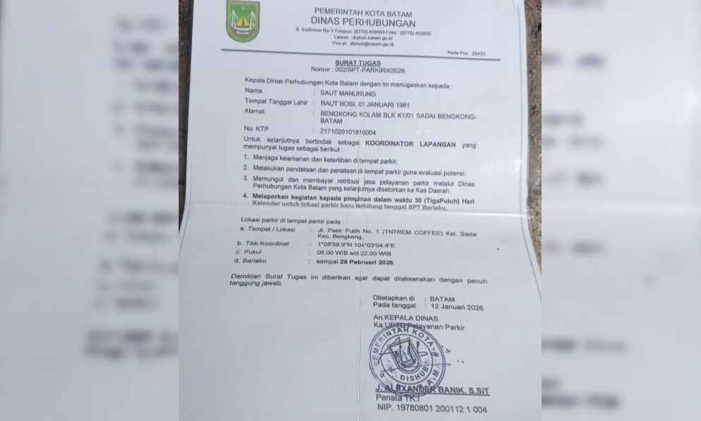 Berdasarkan dokumen resmi tersebut, Dishub Kota Batam menugaskan Saut Manurung sebagai Koordinator Lapangan pengelolaan parkir di lokasi Jl. Pasir Putih No. 1 (TNTREM Coffee), Kelurahan Sadai, Kecamatan Bengkong.